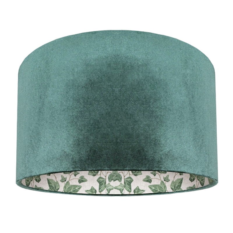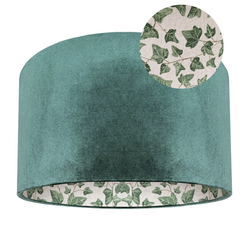 Prawdziwe zaskoczenie kryje wnętrze abażura, czyli lniana tkanina ozdobiona pięknym, naturalistycznym wzorem pędów i liści bluszczu. Motyw roślinny tworzy wraz z zielonym aksamitem harmonijną kompozycję, która po zapaleniu światła podkreśla przytulny charakter pomieszczenia. To idealne połączenie dla osób ceniących subtelne, a jednocześnie efektowne detale.