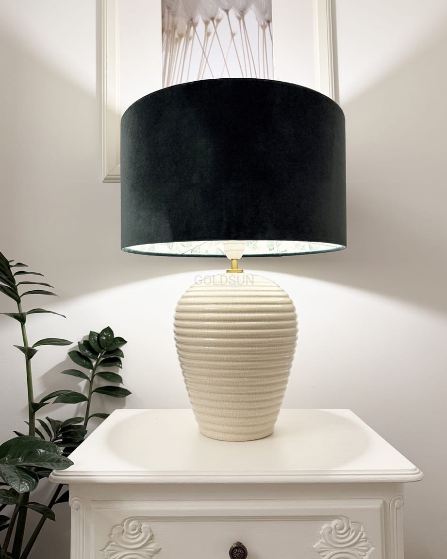 Ten wyjątkowy abażur do lampy zachwyca nie tylko formą, lecz także bardzo starannym doborem tkanin. Zewnętrzną część klosza pokrywa miękki, luksusowy aksamit w odcieniu szlachetnej zieleni, który dzięki subtelnemu połyskowi pięknie podkreśla strukturę tej wyjątkowej tkaniny. To element, który z łatwością wniesie do wnętrza nutę elegancji, idealnie współgrając z oświetleniem w salonie, sypialni lub gabinecie.
