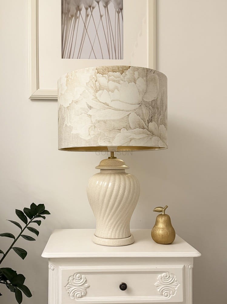 Przepiękny abażur, w jakości premium, prezentuje się niezwykle elegancko i stylowo. Delikatna tkanina w odcieniach ecru oraz beżów z wzorem dużych kwiatów peoni została podklejona cieniutką pleksi w kolorze szampańskiego złota. Abażur pasuje do lampy stojącej oraz stołowej. Subtelny wzór wprowadzi do wnętrza odrobinę koloru ale z pewnością go nie przytłoczy. Na uwagę zasługuje również fakt, iż abażur został ręcznie wykonany.