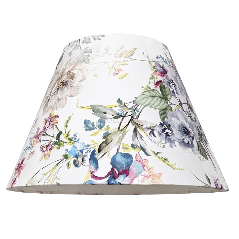 abażur: 8S o wymiarach średnica 22/45 cm, wysokość 30 cm, wykonany z tkaniny WELUROWEJ, wzór WIOSNA (białe tło z kolorowymi kwiatami). Od spodu biała folia. Zdjęcia przedstawiają ten sam abażur z różnych stron.