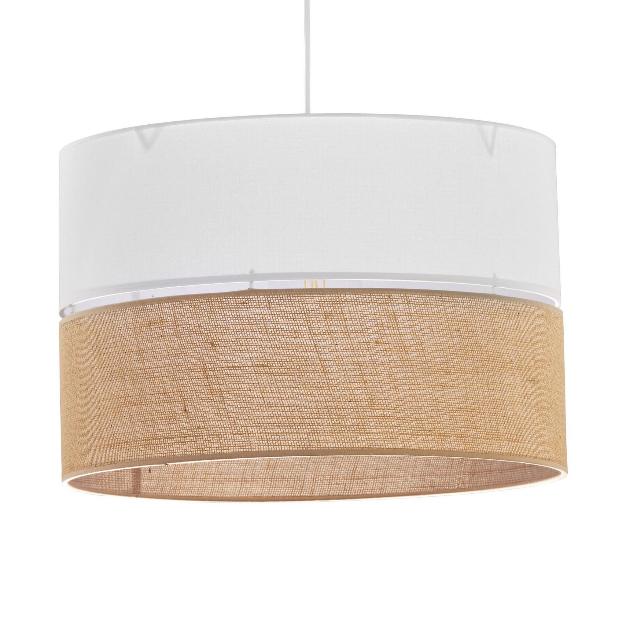 Biało beżowa lampa z dużym abażurem. Elegancka lampa wisząca z abażurem w dwóch kolorach białym oraz beżowym, przepuszcza światło rozświetlając wnętrze dzięki aż 3 punktom świetlnym. Sprawdzi się jako uzupełnienie wnętrz białych połączonych z drewnem oraz naturalnymi elementami wystroju. Jeśli lubisz naturalne wykończenia, ta lampa jest dla ciebie.