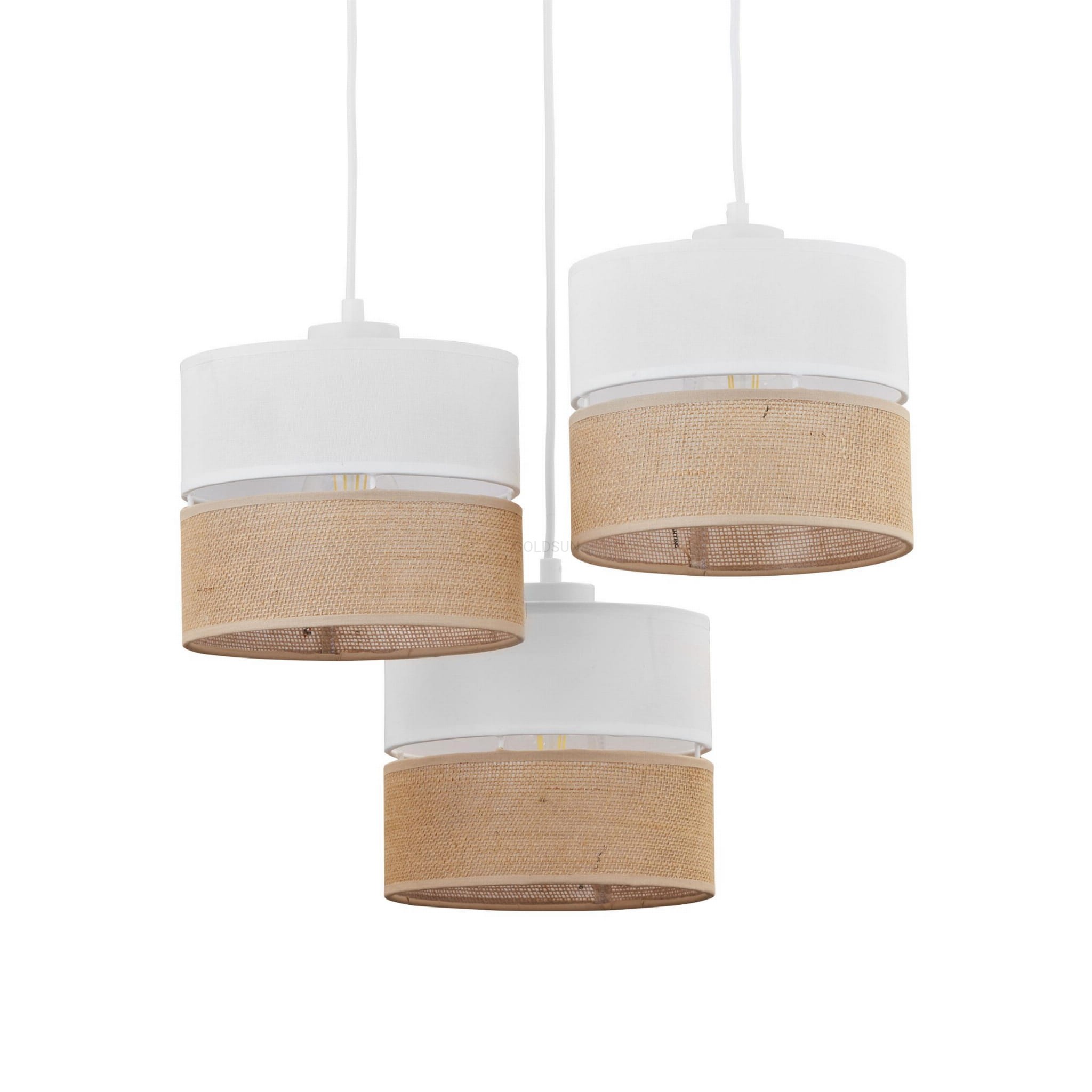 Biało beżowa lampa z trzema abażurami. Potrójna naturalna lampa wisząca z abażurami w dwóch kolorach białym oraz beżowym, przepuszcza światło rozświetlając wnętrze dzięki aż 3 punktom świetlnym. Sprawdzi się jako uzupełnienie wnętrz białych połączonych z drewnem oraz naturalnymi elementami wystroju. Jeśli lubisz naturalne wykończenia, ta lampa jest dla ciebie.