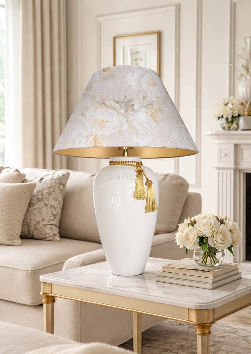 Biało-złota lampa ceramiczna stołowa z abażurem w beżowe kwiaty peonii. Biała elegancka podstawa w jednolitym białym kolorze i eleganckim wykończeniu, wykonana z ceramiki oraz piękny abażur tworzą wyjątkową całość. Lampa idealna do jasnych klasycznych wnętrz, przepięknie prezentuje się na tle białych i beżowych mebli i ścian. Możesz ją postawić na stole, ławie lub na komodzie. Idealna do salonu lub dużej sypialni, stworzy niepowtarzalny, romantyczny klimat.