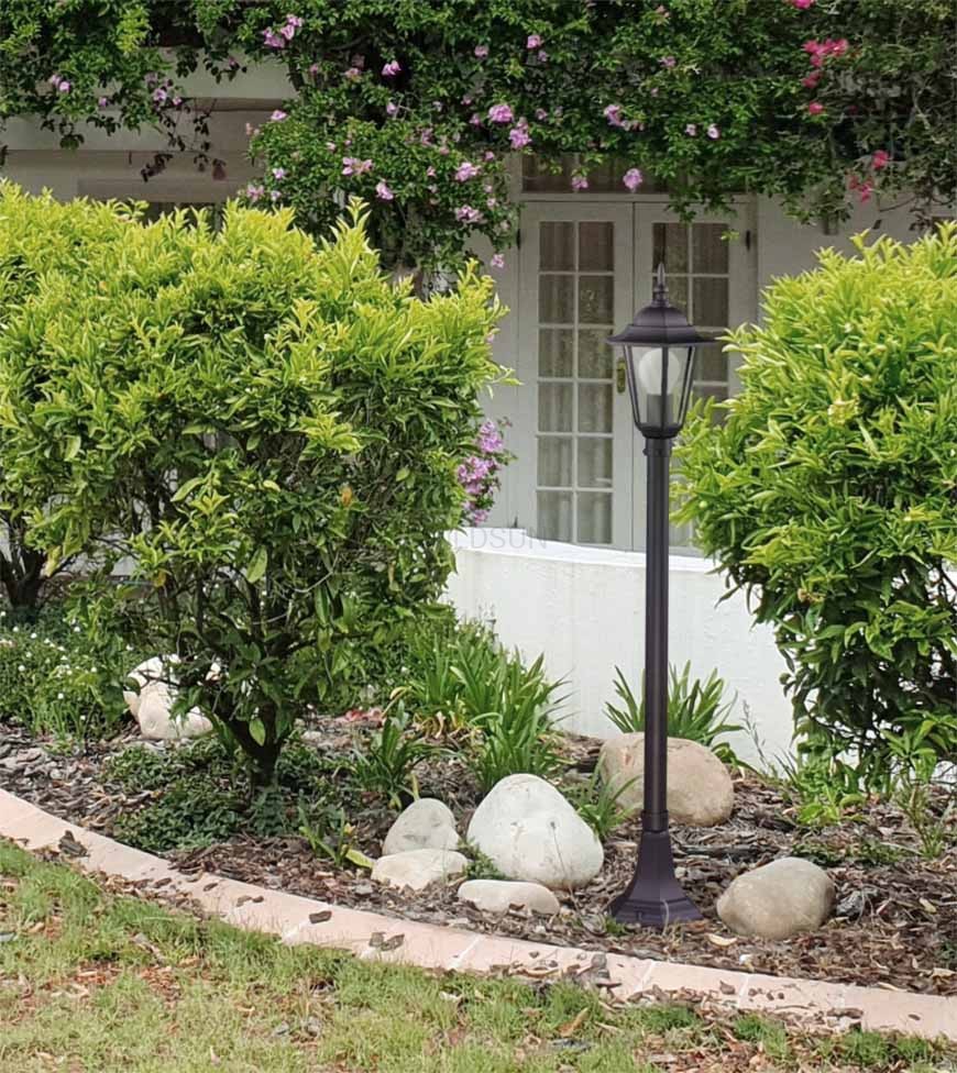 Czarna stojąca lampa do ogrodu. Lampa w uniwersalnym czarnym kolorze, która świetnie sprawdzi się jako oświetlenie ogrodowe. Idealnie oświetli otoczenie na zewnątrz. Produkt starannie wykonany.