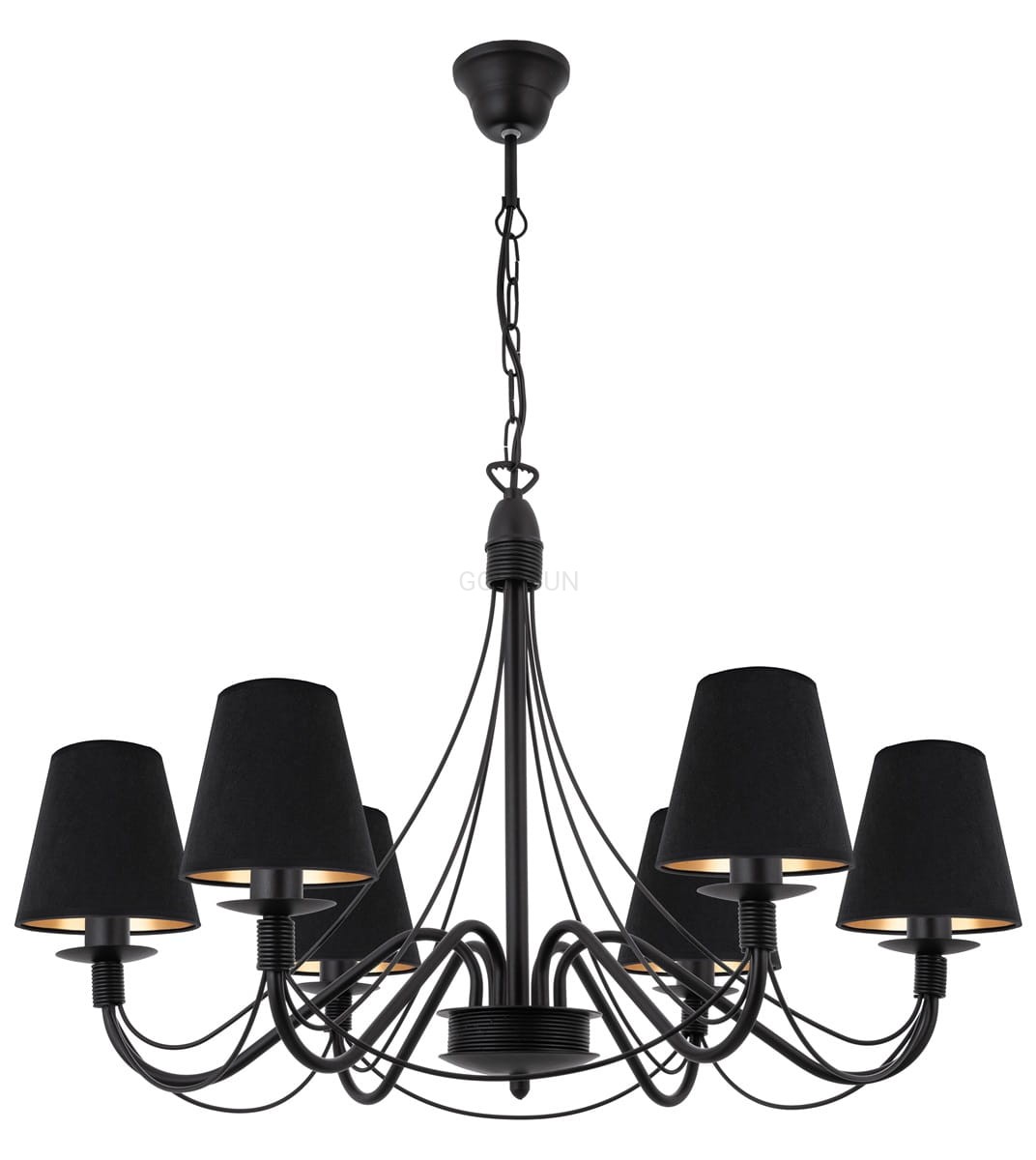 Czarny klasyczny żyrandol z weluru. Elegancki 6-ramienny żyrandol z pięknym czarnym stelażem to idealna propozycja do sypialni lub do jadalni. Ta sufitowa lampa wisząca, zachwyca starannym wykonaniem i ponadczasowym wzornictwem została wykończona zgrabnymi welurowymi abażurami w kolorze czarnym ze złotym wnętrzem. Lampy z serii HORTENSJA doskonale komponują się z wnętrzami urządzonymi w klimatach klasycznych, angielskich i vintage.