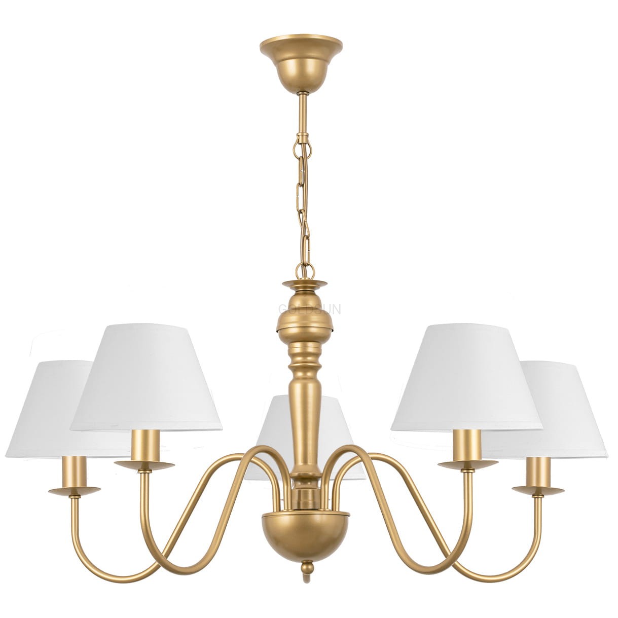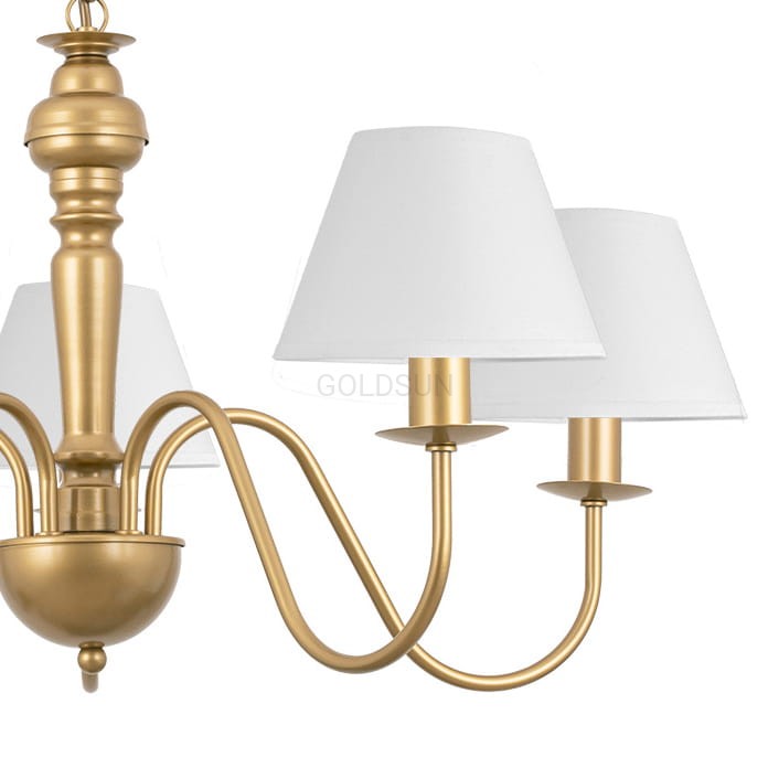 Dekoracyjna lampa sufitowa do eleganckiego wnętrza GOLDSUN w odcieniu złoty piasek z klasycznymi białymi abażurami to ponadczasowa propozycja do eleganckiego wnętrza. Złoty stelaż dodaje całości szlachetnego wyglądu, a jasne klosze zapewniają miękkie, rozproszone światło. To lampa, która doskonale odnajdzie się w salonie, jadalni czy dużej sypialni. Sprawdzi się tam, gdzie zależy nam na jasności i przytulności w jednym. Model wyprodukowano w Polsce.