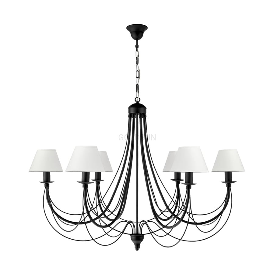 Duża czarna lampa wisząca do salonu JEWESOS będzie wspaniale prezentować się w przestronnym salonie. Czarny żyrandol 6-ramienny na starannie wykonanym stelażu z abażurkami w kolorze białym to idealny dodatek zarówno do tradycyjnie urządzonego jak i bardziej nowoczesnego wnętrza. Akcenty tradycyjnej czerni i bieli obecne w wystroju wnętrza świetnie podkreślą urodę tej niebanalnej lampy sufitowej.