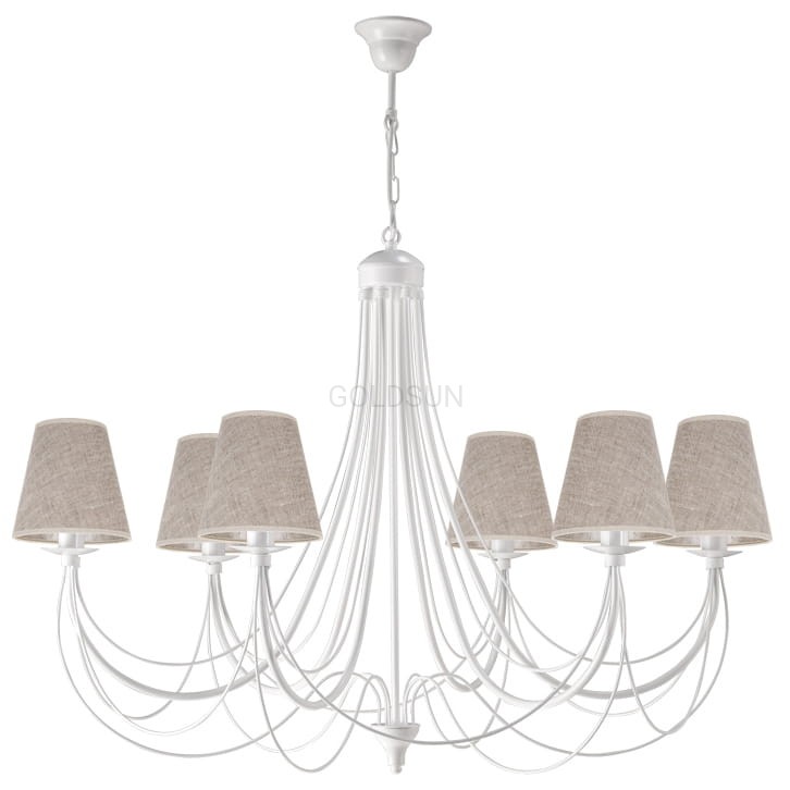 Duży biały żyrandol klasyczny JEWESOS będzie idealnie prezentować się w dużym salonie lub w eleganckiej restauracji, czy hotelu. Piękny żyrandol 6-ramienny na starannie wykonanym stelażu z abażurami w kolorze lnianym to idealny dodatek zarówno do tradycyjnie urządzonego jak i bardziej nowoczesnego wnętrza. Akcenty bieli i beżu obecne w wystroju wnętrza świetnie podkreślą urodę tej niebanalnej lampy wiszącej.