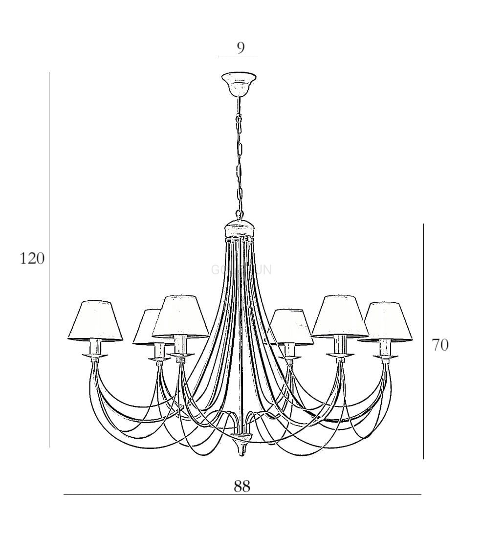 wysokość całkowita: 120 cm; (możliwość samodzielnego skrócenia łańcucha, długość lampy na 1 oczku 85 cm, na indywidualne zamówienie istnieje również możliwość zamówienia żyrandola z dłuższym łańcuchem)