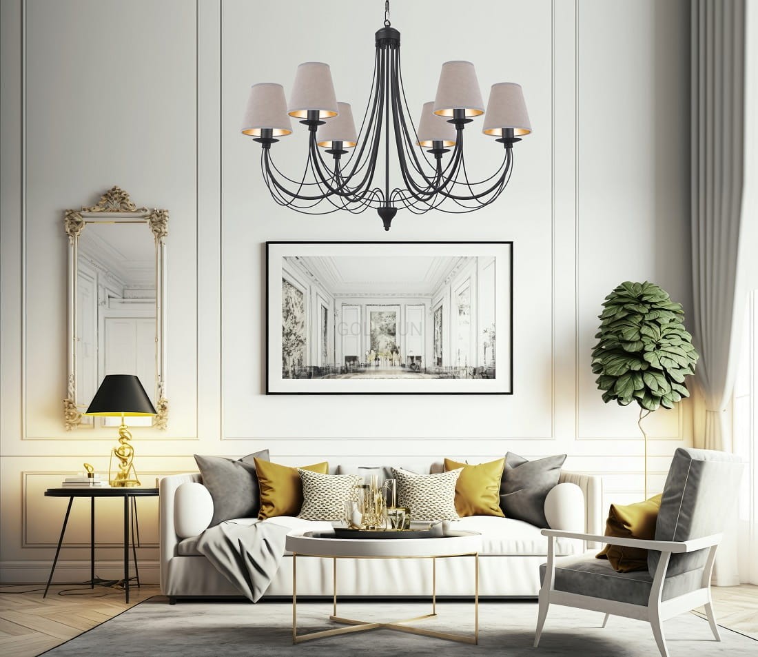 Duży żyrandol do salonu JEWESOS to propozycja do eleganckich, przestronnych salonów. Czarny żyrandol z ciekawym stelażem o lekkiej, nieprzytłaczającej wnętrza konstrukcji został wykończony pięknymi abażurami z weluru ze złotym wnętrzem, dzięki czemu daje efekt niezwykłej elegancji. Akcenty czerni i beżu obecne w wystroju wnętrza świetnie podkreślą urodę tej niebanalnej lampy sufitowej. Żyrandol jest idealną propozycją zarówno do domów jak i do miejsc użyteczności publicznej typu restauracje, sale balowe, czy hotele.