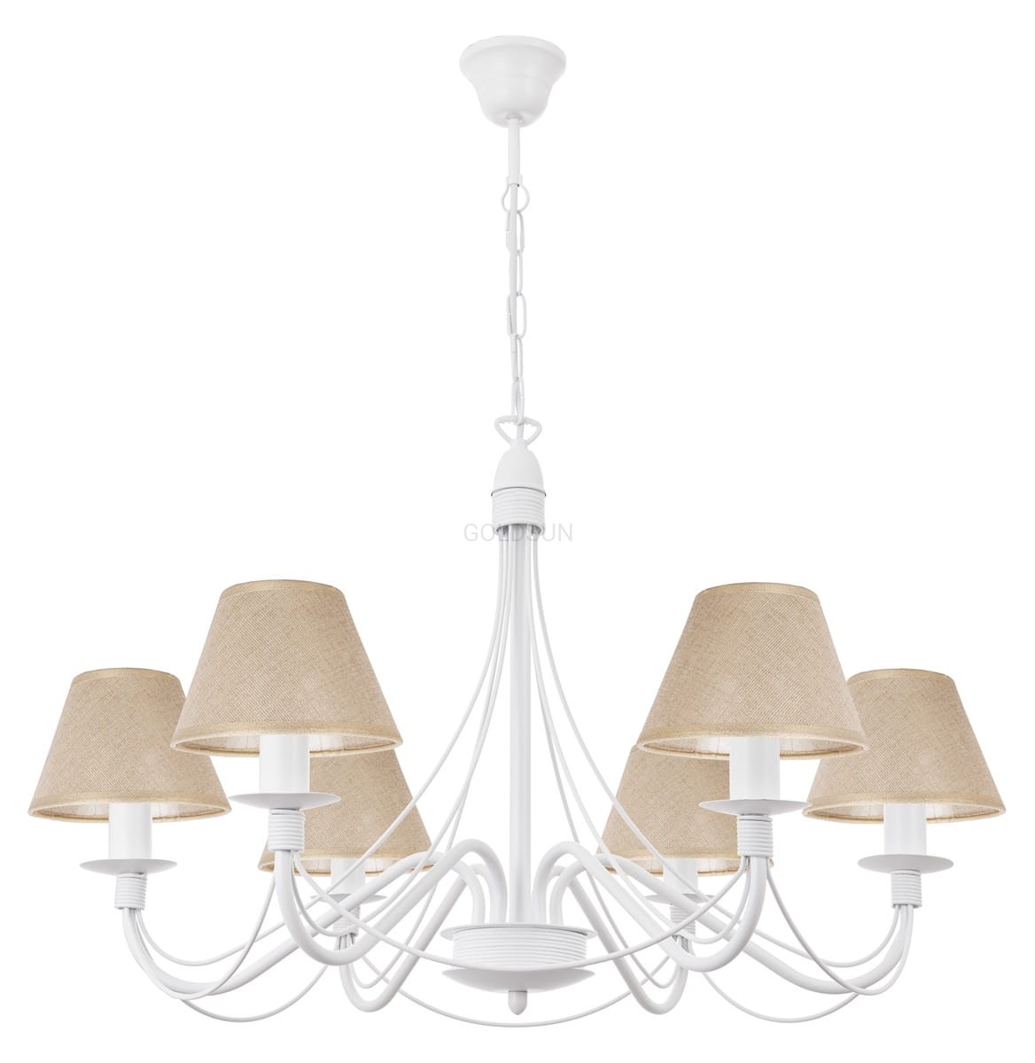 Efektowny żyrandol z lnianymi abażurami. Żyrandol 6-ramienny to idealna propozycja do klasycznych wnętrz, pasuje również do stylu prowansalskiego. Biały stelaż został wzbogacony pięknymi lnianymi ze złotą nitką abażurkami, które delikatnie rozprowadzają światło po wnętrzu. Produkt polski.