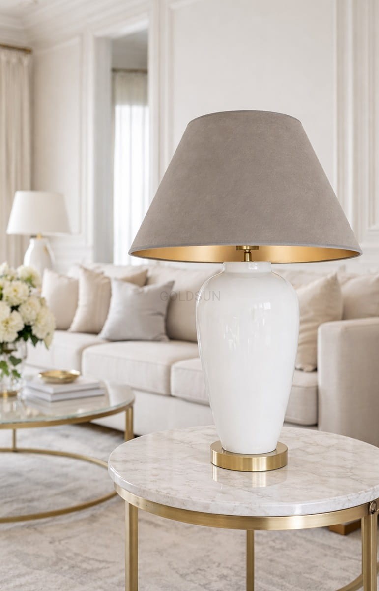 Elegancka lampa stołowa biała z beżowo-złotym abażurem BONA. Prosta biała podstawa w jednolitym gładkim białym kolorze, wykonana z ceramiki oraz beżowo-złoty welurowy abażur stanowią wyjątkową, ponadczasową całość. Przepiękna smukła forma lampy idealne pasuje do eleganckich oraz nowoczesnych wnętrz, doskonale prezentuje się na tle stylowych elementów wyposażenia. Możesz ją postawić na stole lub komodzie. Idealna do klasycznego salonu, holu lub do sypialni, stworzy niepowtarzalny klimat, dzięki złotemu wnętrzu abażura daje ciepłe, nastrojowe i przyjemne światło.