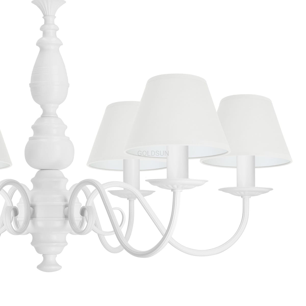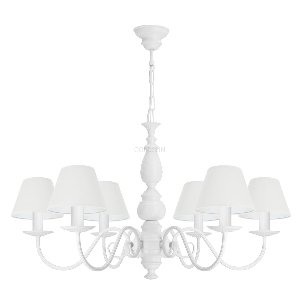 Elegancki biały żyrandol do salonu idealny do przestronnych pomieszczeń. Stylowy, metalowy stelaż inspirowany stylem klasycznym został pomalowany na kolor czystej bieli i w połączeniu z białymi abażurami prezentuje się niezwykle elegancko. Żyrandol idealny do wnętrz urządzonych nie tylko klasycznie ale również w duchu vintage, czy prowansalskim. Produkt w całości wykonany w Polsce.