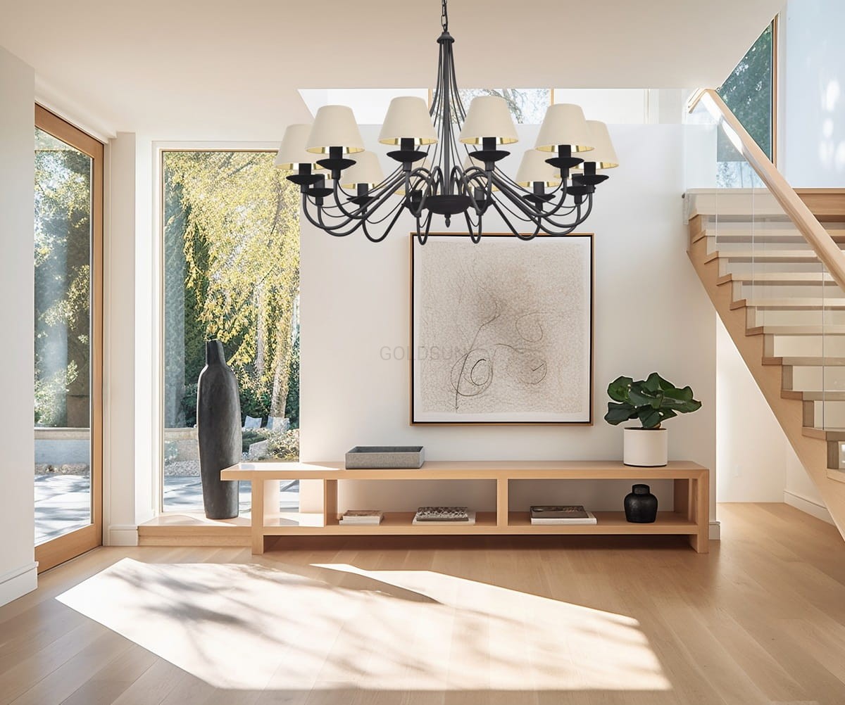 Elegancki czarny żyrandol do dużych salonów ROMA, to duży, 12-ramienny żyrandol, który doskonale będzie pasować do obszernych wnętrz - takich jak salon czy nawet sala balowa lub restauracja. Smukłe ramiona tej lampy zostały wykończone abażurami ze złotym wnętrzem, starannie wykonanymi z tkaniny o delikatnym, beżowym kolorze. Żyrandol ten urozmaici każde pomieszczenie i z pewnością nie pozostanie niezauważony.