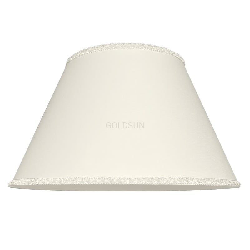 Elegancki kremowy abażur do lampy z dekoracyjną lamówką w kształcie stożka do lampy podłogowej lub do dużej lampy stołowej wykonany z tkaniny certyfikowanej. Abażur najwyższej jakości wyprodukowany przez polskiego producenta.