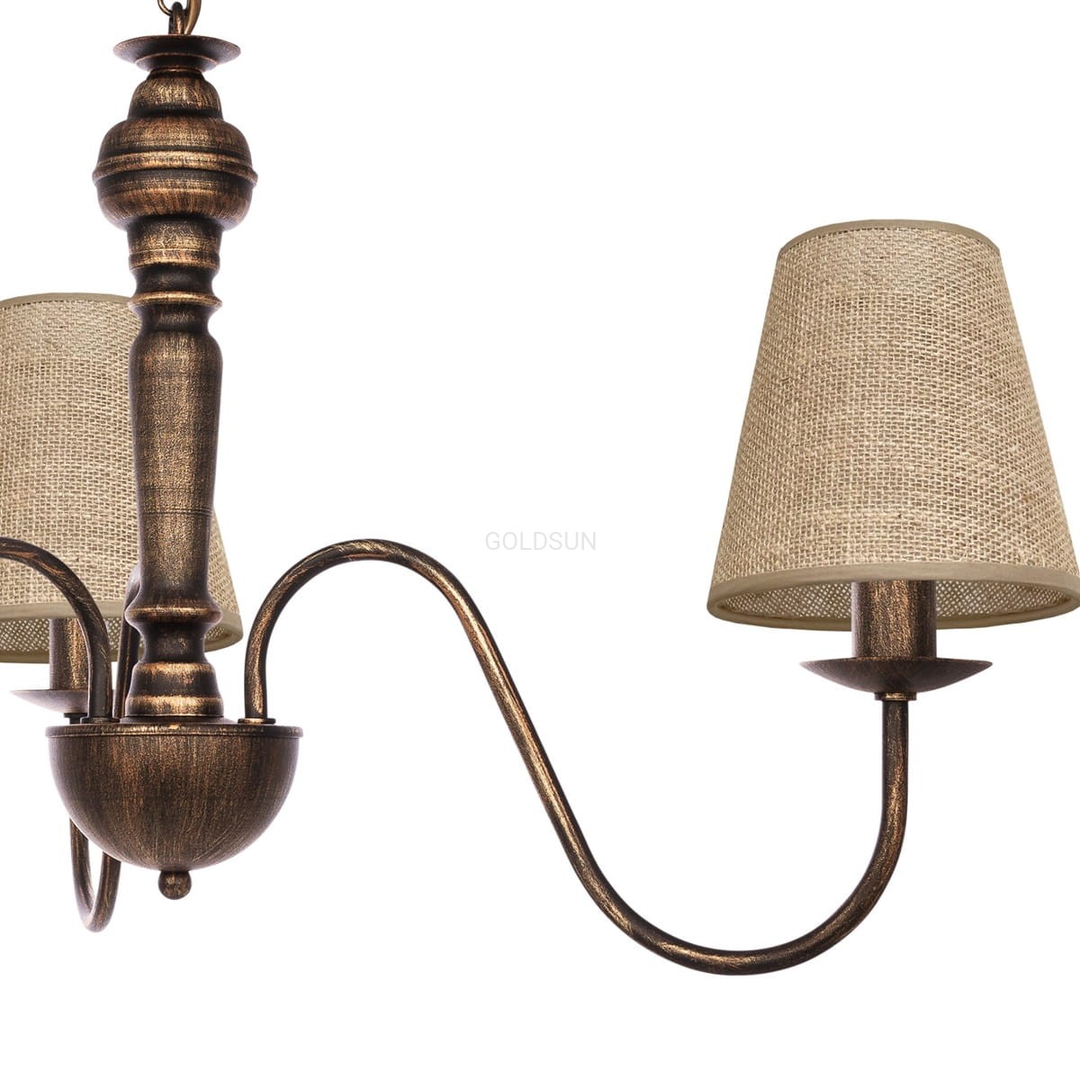 Lampa sufitowa w stylu vintage 3-ramienna GOLDSUN. Żyrandol klasyczny o metalowej konstrukcji w kolorze czarno-złotym, z jutowymi abażurami, to gratka dla miłośników klasycznych wnętrz z charakterem. Materiałowe klosze wykonane z tkaniny w kolorze karmelowym doskonale rozpraszają światło, dając jasny i przytulny efekt. Postarzany stelaż z wykończeniem w odcieniu starego złota dodaje całości uroku i ponadczasowego stylu. To idealna lampa do salonu, jadalni lub klasycznej sypialni. Model wyprodukowano w Polsce.