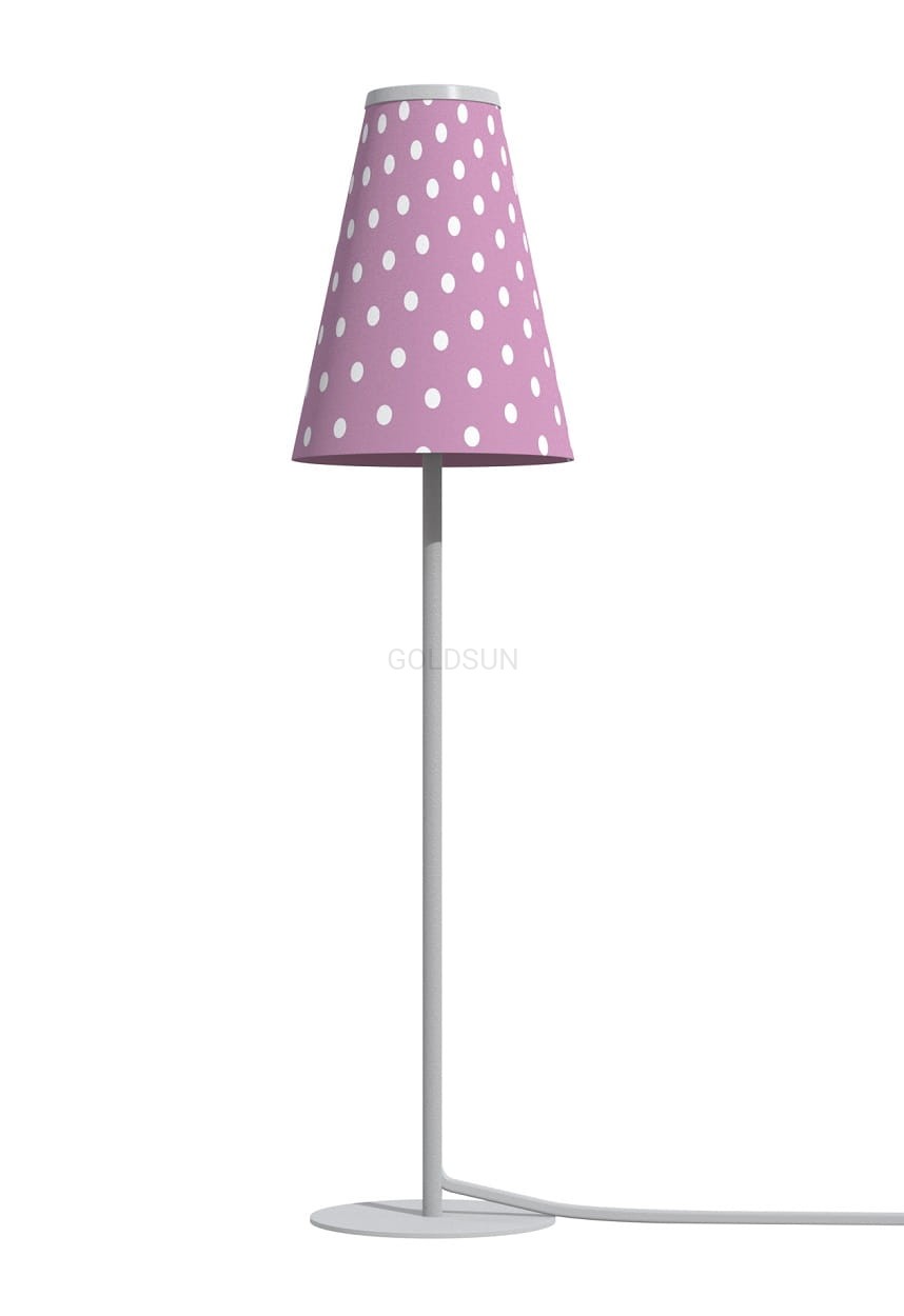 materiał: podstawa, aluminium lakierowane na kolor BIAŁY, abażur wykonany z tworzywa w kolorze RÓŻOWYM Z BIAŁYMI KROPKAMI.
