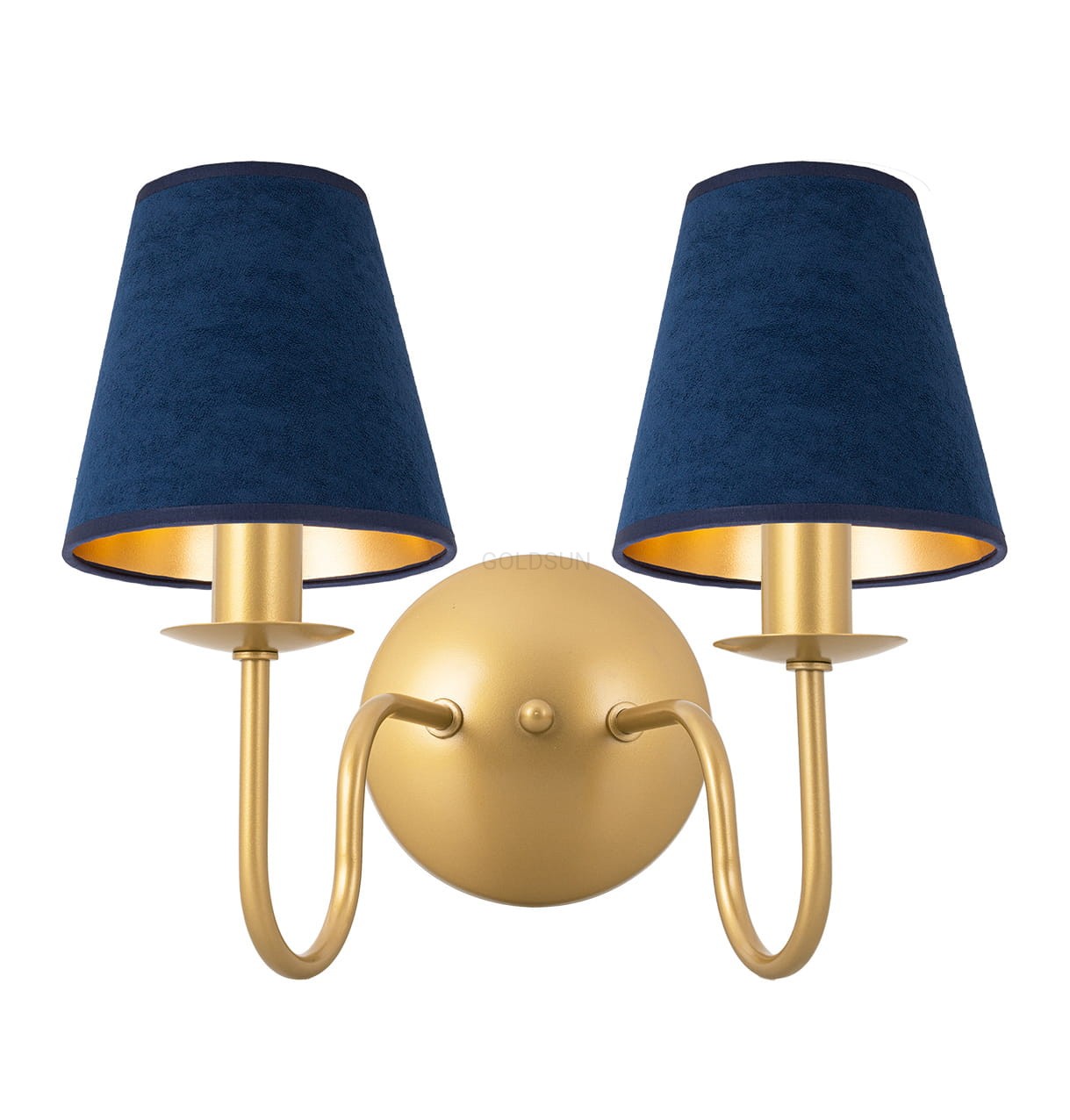 Podwójny kinkiet do wnętrza w stylu nowojorskim GOLDSUN z abażurami z granatowego weluru i stelażem w kolorze złotego piasku to szykowna propozycja do eleganckich przestrzeni. Głęboki odcień kloszy dodaje wnętrzu wyrazistości, a welurowa struktura wprowadza wrażenie ciepła i miękkości. Dwa źródła światła sprawdzą się wszędzie tam, gdzie potrzebne jest subtelne, ale skuteczne oświetlenie. Model wyprodukowano w Polsce.
