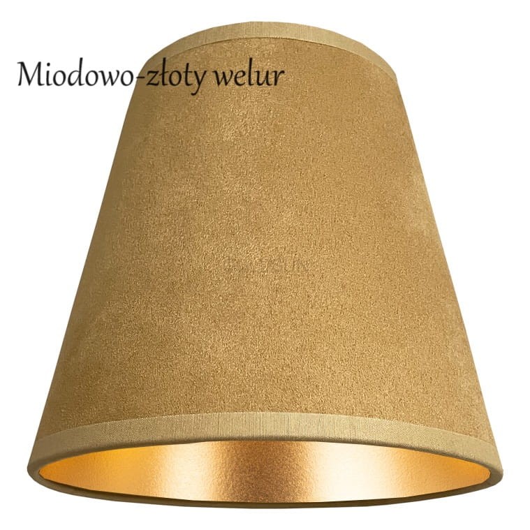 abażur: AB montowany na żarówkę, o wymiarach średnica 9/15 cm, wysokość 14 cm, w kolorze 55 GRANATOWY WELUR ze złotym wnętrzem lub dowolnie wybrany z prezentowanych na zdjęciach (podczas zakupu należy zaznaczyć wybrany kolor abażurów)