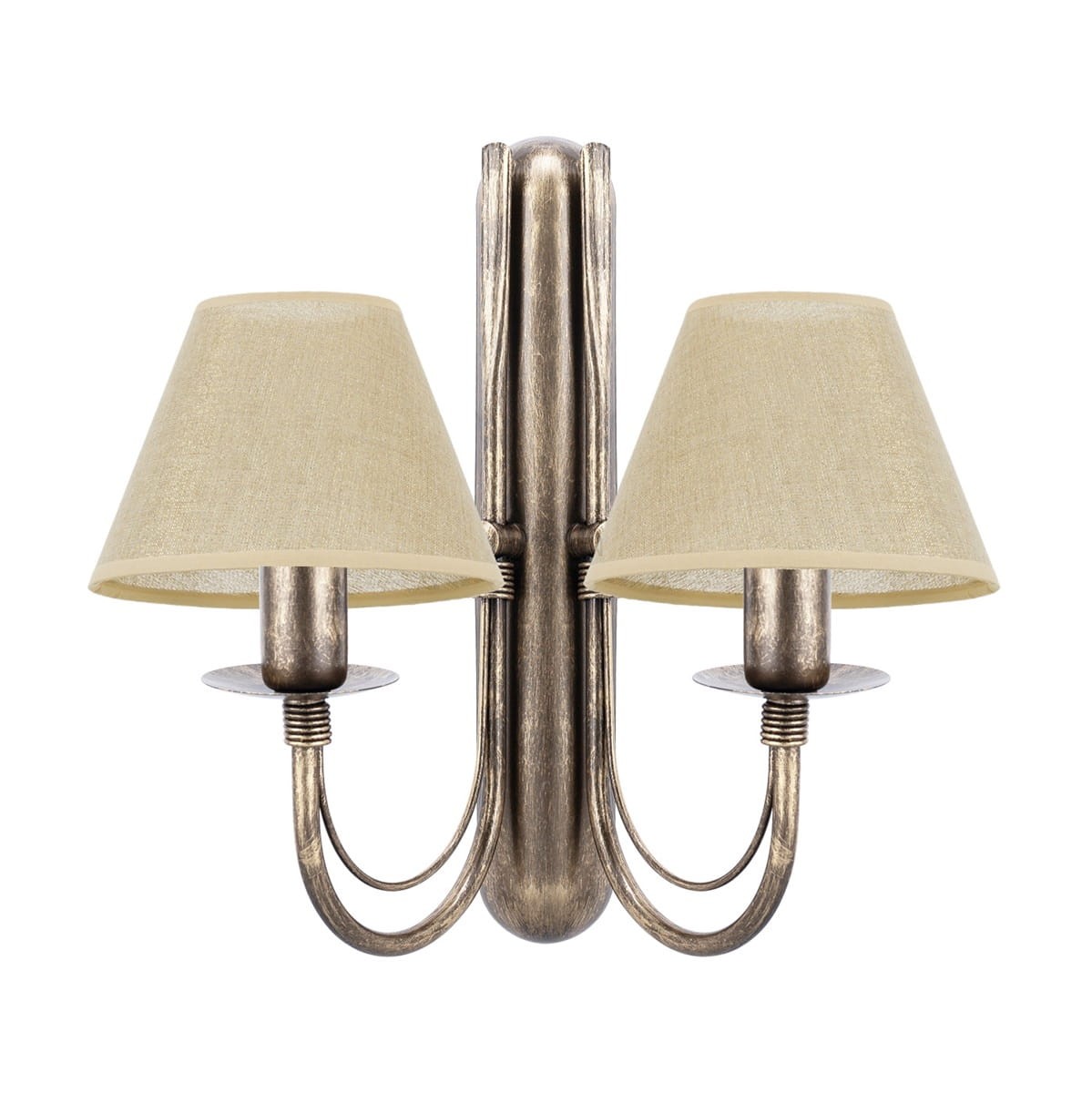 Podwójny kinkiet z abażurami stare złoto. Lampa na ścianę idealna do salonów, sypialni czy ciemnych przedpokojów, które wymagają wyjątkowego doświetlenia w klasycznym stylu. Pięknie patynowany stelaż oraz lniano-złote abażurki tworzą wyjątkową całość. Starannie wykonany i ponadczasowy kinkiet to świetne uzupełnienie żyrandoli JEWESOS.