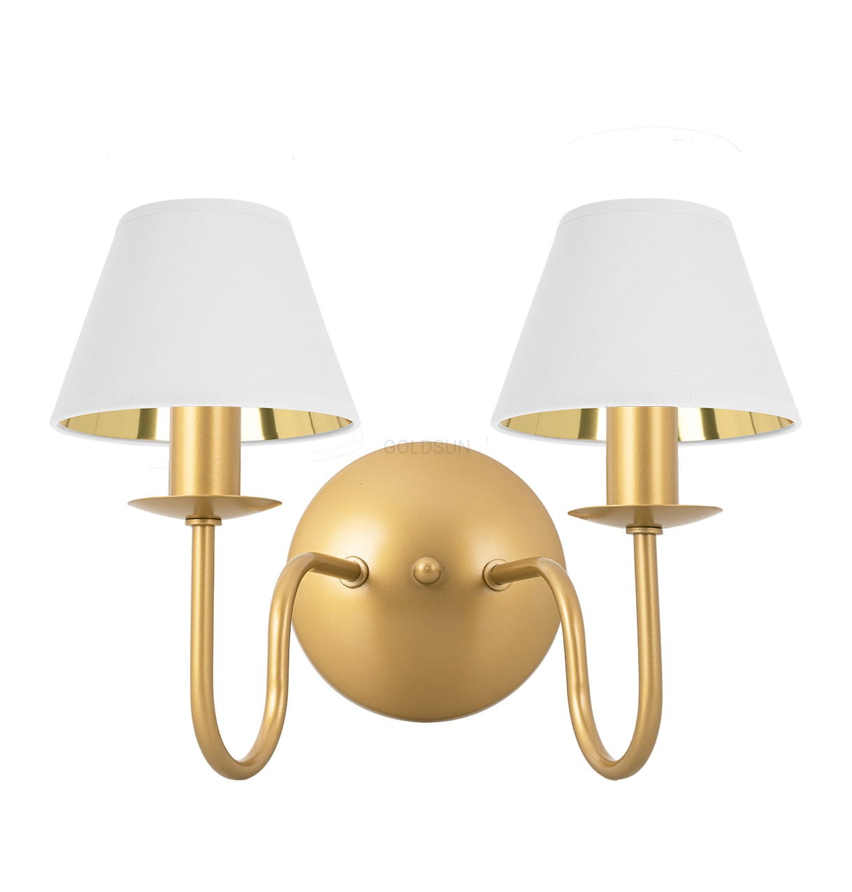 Podwójny kinkiet z tkaninowymi abażurami do eleganckich wnętrz GOLDSUN z białymi abażurami i złotym środkiem to rozwiązanie dla tych, którzy szukają klasyki z efektem zapierającym dech w piersi. Po zapaleniu światła złote wnętrza odbijają blask, tworząc przytulną, wyjątkową atmosferę. Złoty stelaż w piaskowym odcieniu podkreśla elegancki charakter lampy. Doskonały do salonów, jadalni czy korytarzy. Model wyprodukowano w Polsce.