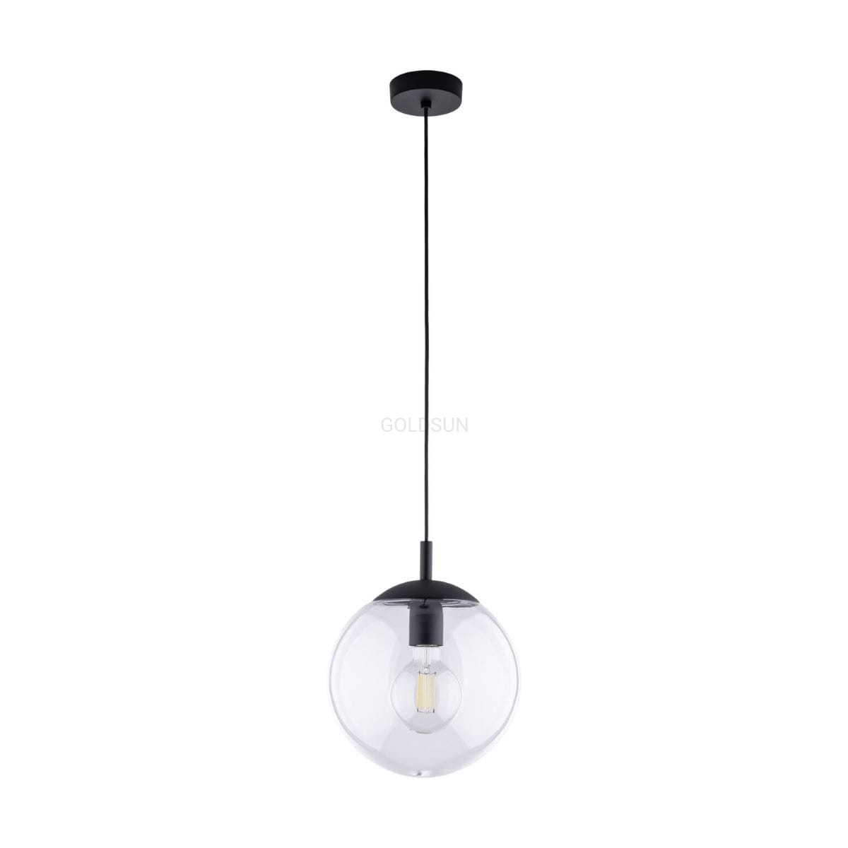 Pojedyncza lampa z transparentnym kloszem. Pojedyncza czarna lampa ze szklanym transparentnym kloszem w kształcie kuli, prezentująca się bardzo efektownie idealna do sypialni jadalni czy salonu, można ją powiesić w centralnym miejscu w pomieszczeniu lub jako lampa nad stół. Pięknie dopełni całą aranżację.