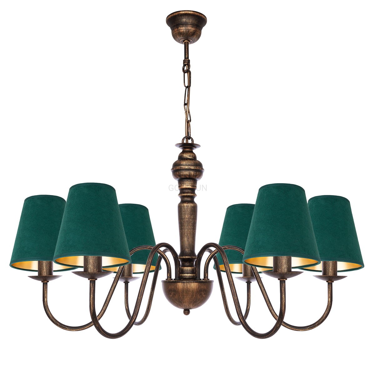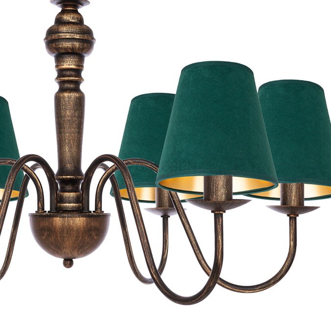 Postarzany żyrandol w stylu klasycznym GOLDSUN z sześcioma ramionami i zielonymi welurowymi abażurami to ciekawa i stylowa propozycja do wnętrz, które potrzebują mocniejszego akcentu. Zieleń kloszy świetnie kontrastuje z postarzaną konstrukcją w czarno-złotym kolorze, tworząc efektowną, ale nadal elegancką całość. Dobrze prezentuje się w większych salonach, jadalniach czy klasycznych biurach. Model wyprodukowano w Polsce.