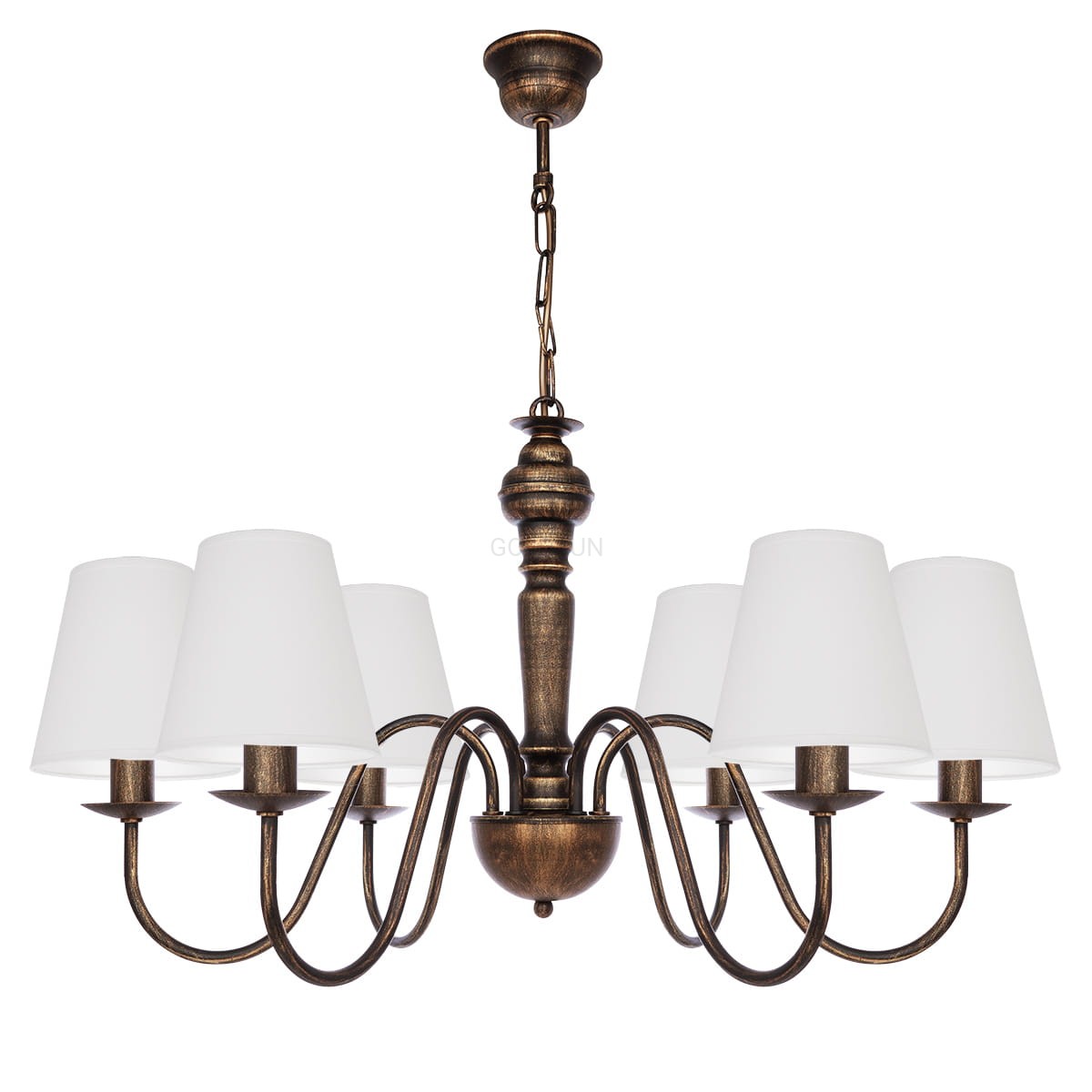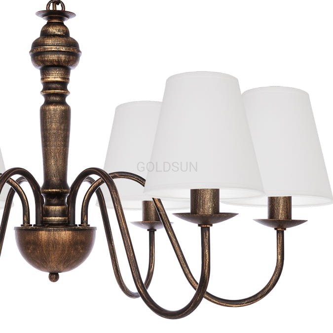 Stalowy żyrandol do pokoju dziennego z abażurami z tkaniny GOLDSUN z sześcioma ramionami i minimalistycznymi, białymi abażurami to elegancka lampa do przestronnych wnętrz. Stelaż w kolorze postarzanego złota i czerni przyciąga wzrok i nadaje całości stylowego wyglądu. Jasne abażury równoważą mocniejszy charakter konstrukcji i wprowadzają do wnętrza więcej światła. Lampa idealna do salonu, jadalni czy dużej sypialni. Model wyprodukowano w Polsce.