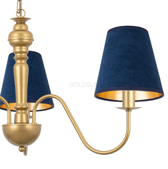 Stalowy żyrandol do wnętrz glamour lub klasycznych GOLDSUN z abażurami z granatowego weluru to lampa, która przyciąga wzrok głębokim kolorem i miękkim wykończeniem kloszy. Granat w połączeniu ze złotym stelażem daje szlachetny i elegancki efekt. To model, który odnajdzie się we wnętrzach w stylu klasycznym, nowojorskim czy glamour. Dobrze sprawdzi się w salonie, przy jadalnianym stole lub w eleganckim holu. Model wyprodukowano w Polsce.