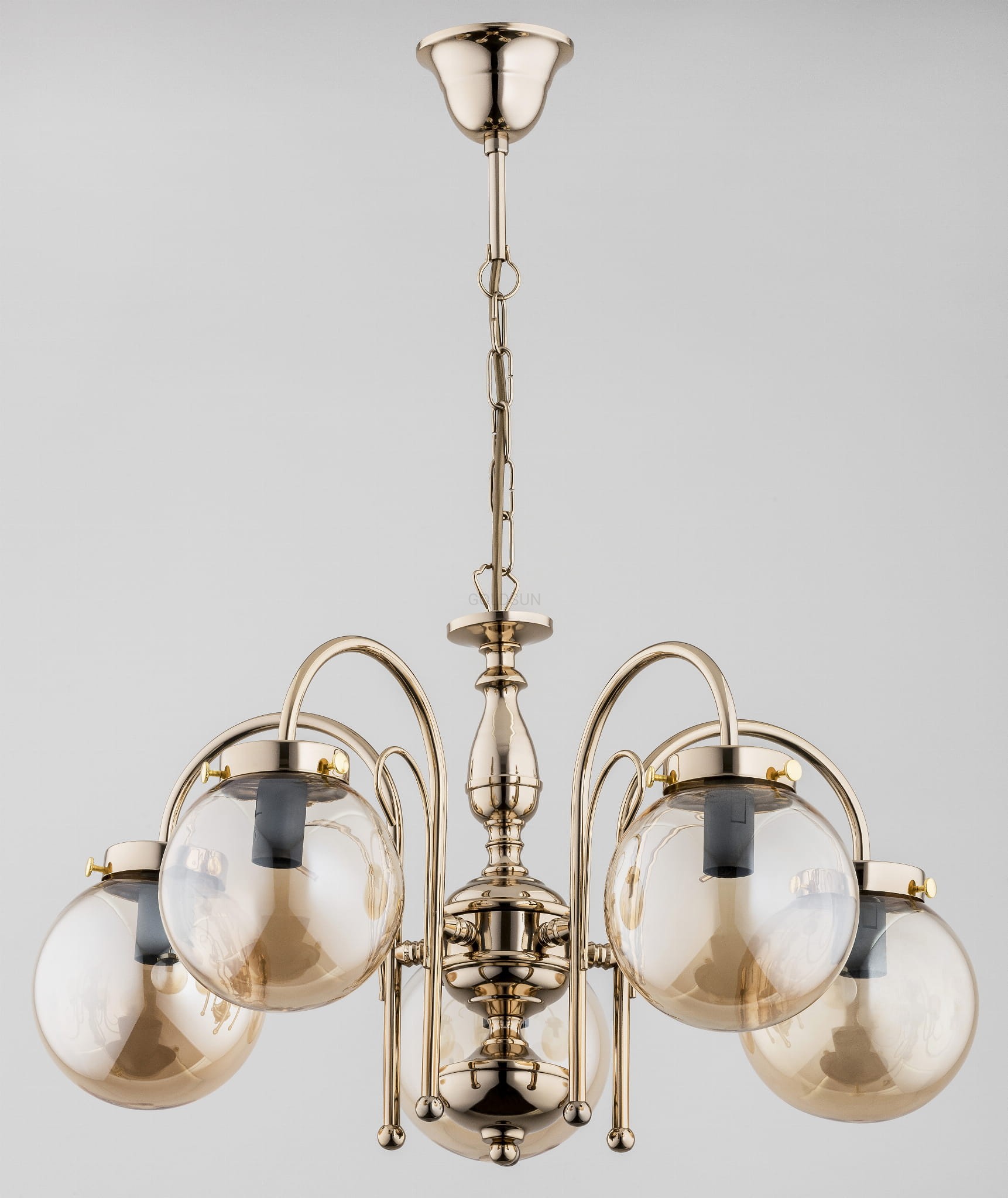 Stylowa lampa z kulami. Niebanalny w swojej formie 5-płomienny żyrandol ze szklanymi oryginalnymi kulami na złotym stelażu świetnie wpisze się w nowoczesny wystrój wnętrz w domu i nie tylko. Z pewnością przyciągnie wzrok. Produkt polski.