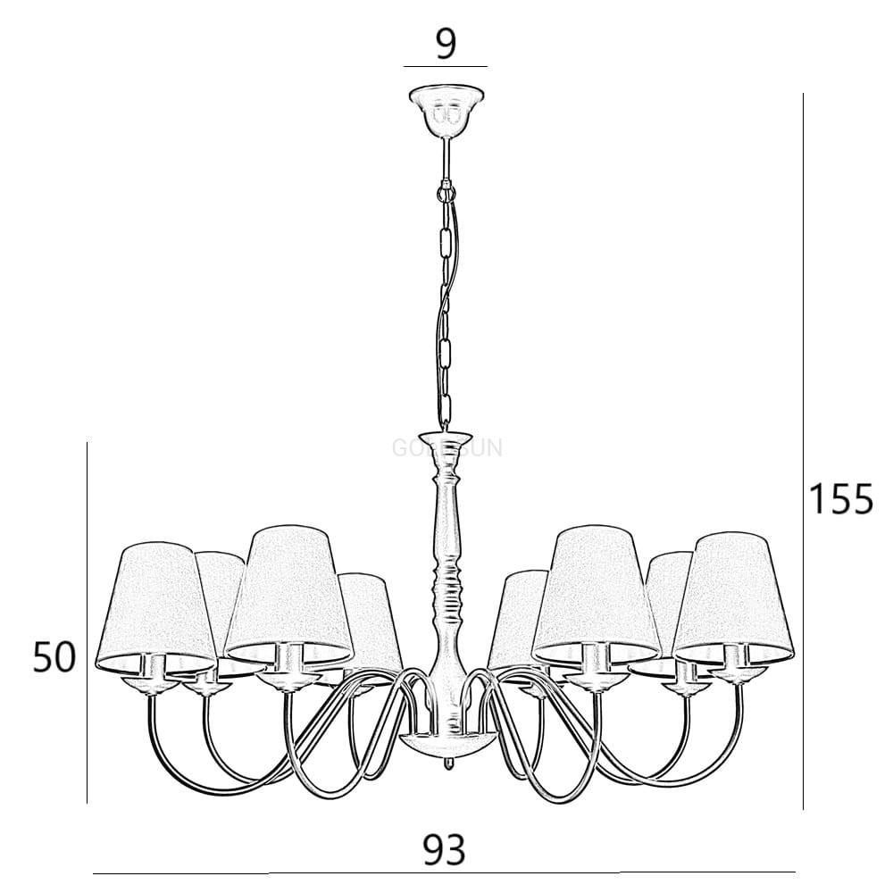 wysokość całkowita: 155 cm; (możliwość samodzielnego skrócenia łańcucha, długość lampy na 1 oczku 65 cm, na indywidualne zamówienie istnieje również możliwość zamówienia żyrandola z dłuższym łańcuchem)