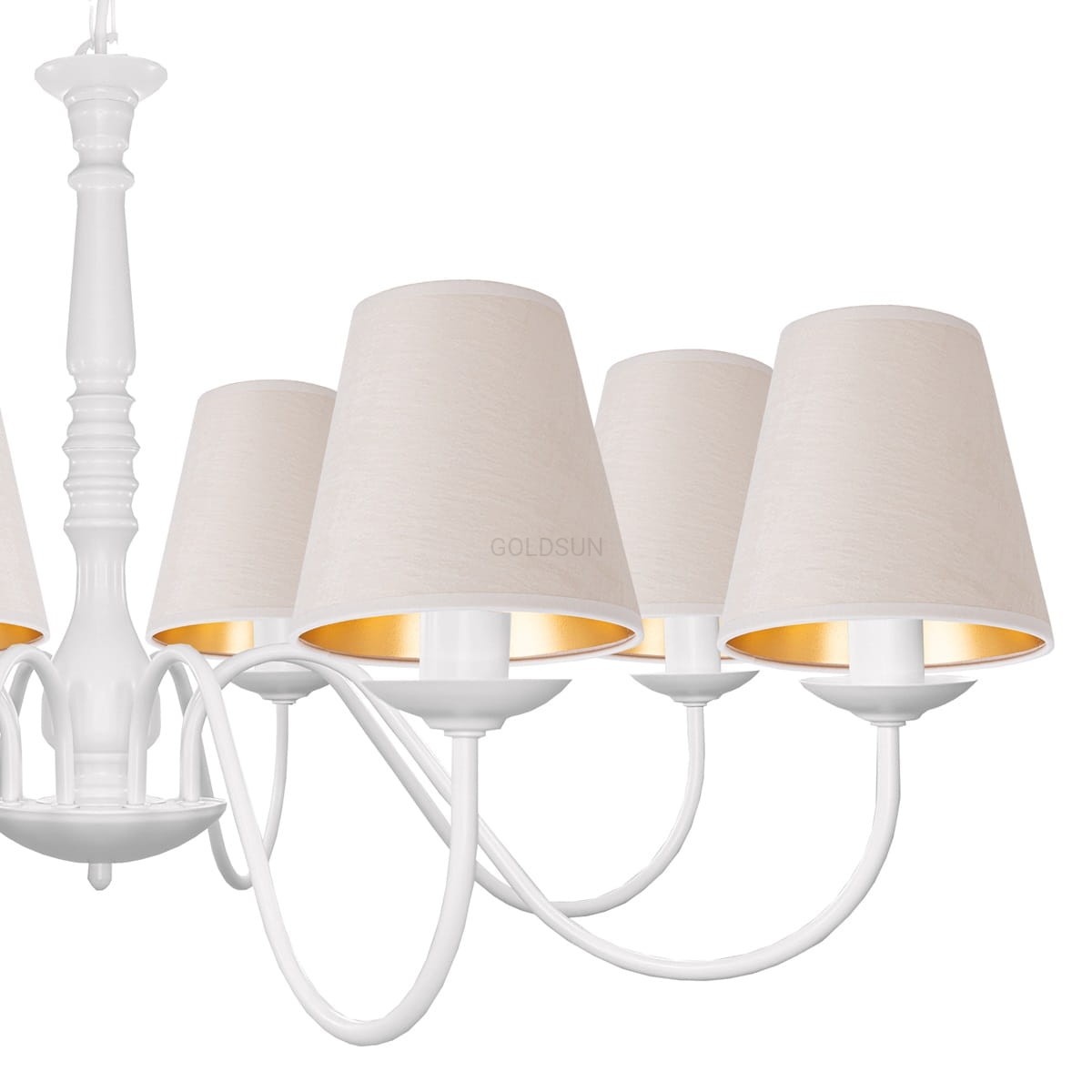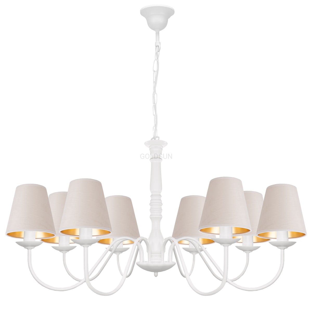 Stylowy biały żyrandol do dużego salonu JASMIN z ośmioma ramionami, to lampa dedykowana do wnętrz urządzonych w stylu klasycznym lub prowansalskim. Przepiękny biały stelaż z ozdobnym elementem po środku przypominającym nieco rzeźbioną w drewnie konstrukcję jest w całości wykonany z metalu. Jego smukłe, szerokie ramiona zakończone są zgrabnymi abażurkami welurowymi z eleganckim, złotym wnętrzem. Jeśli chcesz jeszcze bardziej dopasować kolorystykę tej białej lampy do swojego wnętrza możesz zmienić kolor abażurów na dowolny z prezentowanych na zdjęciach.