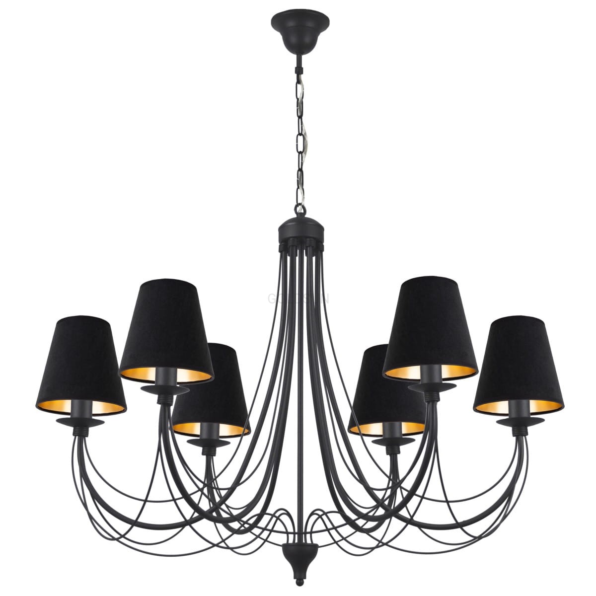 To jasne, że urządzając swoją przestrzeń nie możesz zapomnieć o oświetleniu ale czemu kupując piękne meble miałbyś powiesić na suficie banalną lampę? Oczywiście, że nie dlatego postaw na lampę wyjątkową, która będzie królową Twojego salonu. Duży żyrandol do salonu JEWESOS to propozycja do eleganckich, przestronnych salonów. Czarny żyrandol z pięknym stelażem o lekkiej, nieprzytłaczającej wnętrza konstrukcji został wykończony pięknymi abażurami z czarnego weluru ze złotym wnętrzem, dzięki czemu daje efekt niezwykłej elegancji. Akcenty czerni i złota obecne w wystroju wnętrza świetnie podkreślą urodę tej niebanalnej lampy sufitowej. Żyrandol jest idealną propozycją zarówno do domów jak i do miejsc użyteczności publicznej typu restauracje, sale balowe, czy hotele.