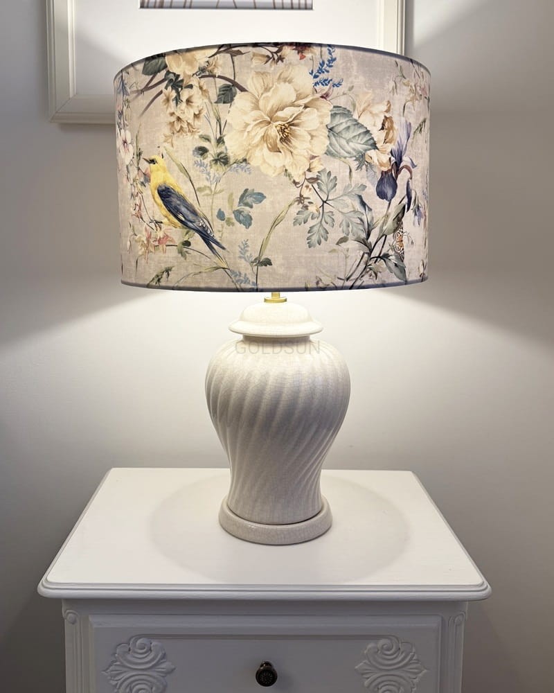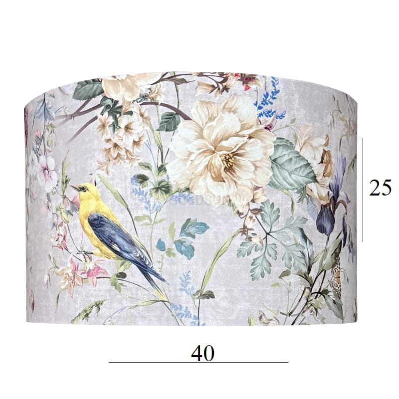 Szary abażur w kwiaty z ptaszkami 14W E27 BIRD 40 wys 25 klosz do lampy walec tkanina welurowa