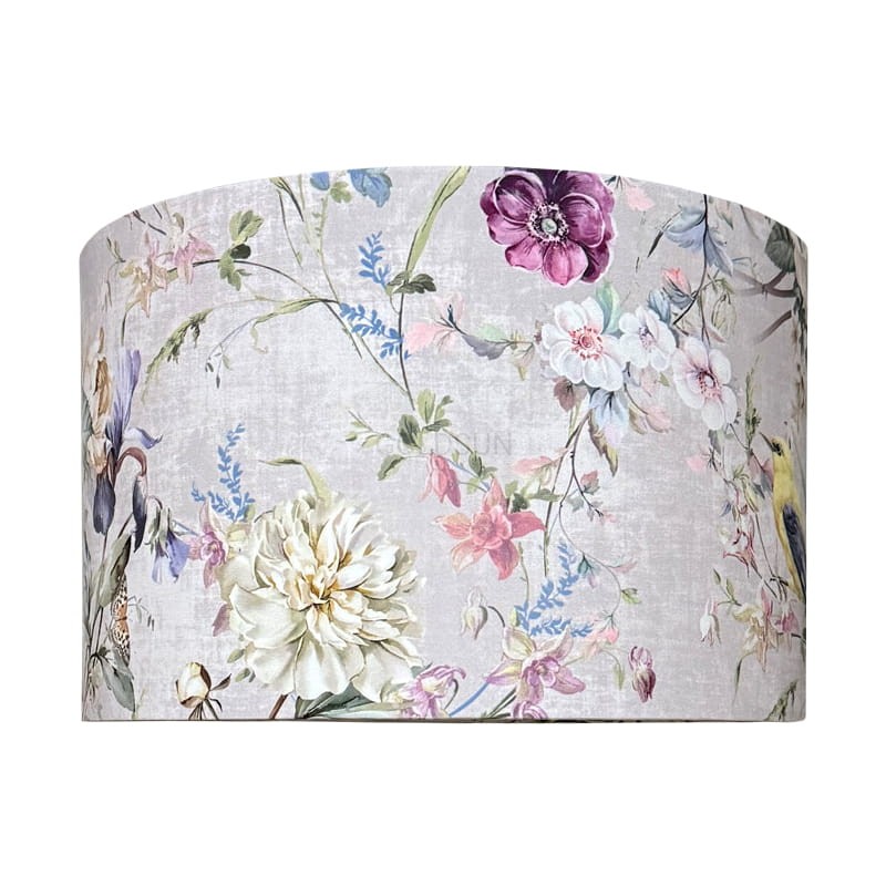 Przepiękny elegancki szary abażur w kolorowe kwiaty i ptaszki do lampy podłogowej, stołowej lub do lampy wiszącej wykonany z delikatnego weluru. Piękny, elegancki wzór w różnokolorowe kwiaty to idealna propozycja do klasycznych oraz prowansalskich wnętrz.