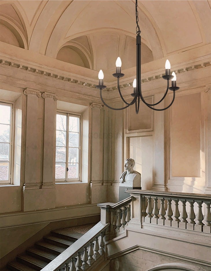 Unikatowy żyrandol świecznikowy. Minimalistyczny w swym wyglądzie żyrandol świecznikowy w kolorze czarnym świetnie sprawdzi się jako oświetlenie w jadalni, sypialni czy salonie. Jego niewątpliwą ozdobą są żarówki w kształcie płomieni. Polski producent.