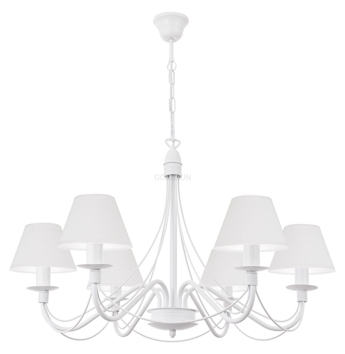 Uniwersalny biały żyrandol salonowy. Żyrandol HORTENSJA 6-płomienny to idealna propozycja do klasycznych wnętrz, pasuje również do stylu vintage oraz prowansalskiego. Biały stelaż został wzbogacony uniwersalnymi białymi małymi abażurkami, które delikatnie rozprowadzają światło po wnętrzu. Produkt polski.