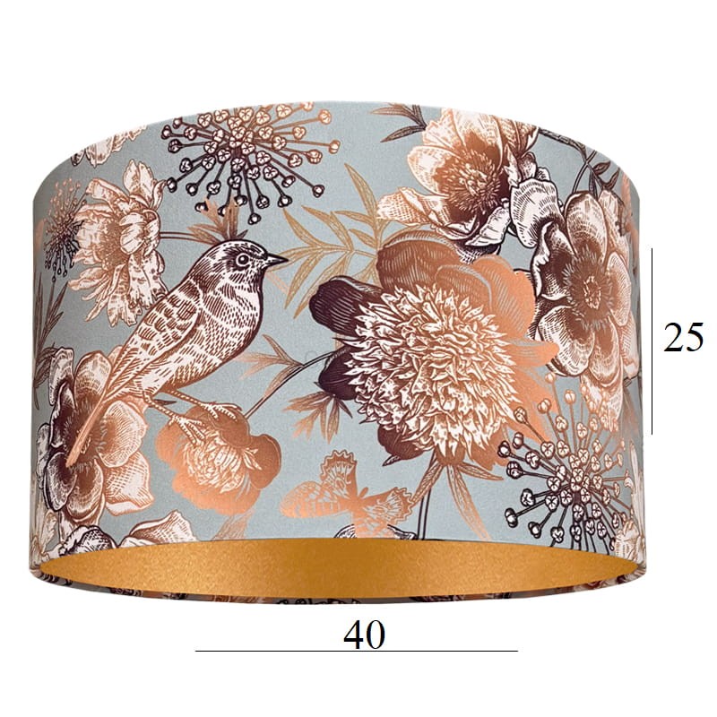 abażur: 14W w kształcie walca o wymiarach średnica 40 cm, wysokość 25 cm, wykonany z tkaniny WELUROWEJ, wzór FLOWERS (tło w kolorze morskim, złote kwiaty i ptaszki). Od spodu złota folia.