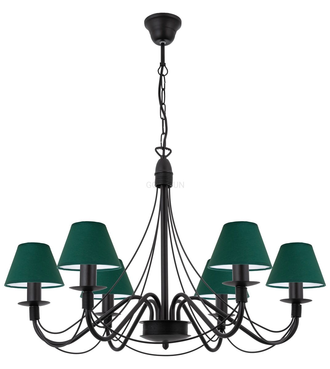 Żyrandol klasyczny z zielonymi abażurami. Żyrandol HORTENSJA 6-płomienny to idealna propozycja do klasycznych wnętrz, pasuje również do stylu vintage a nawet nowoczesnego. Subtelny stelaż został wzbogacony zielonymi abażurkami, które miękko rozprowadzają światło po wnętrzu. Produkt polski.
