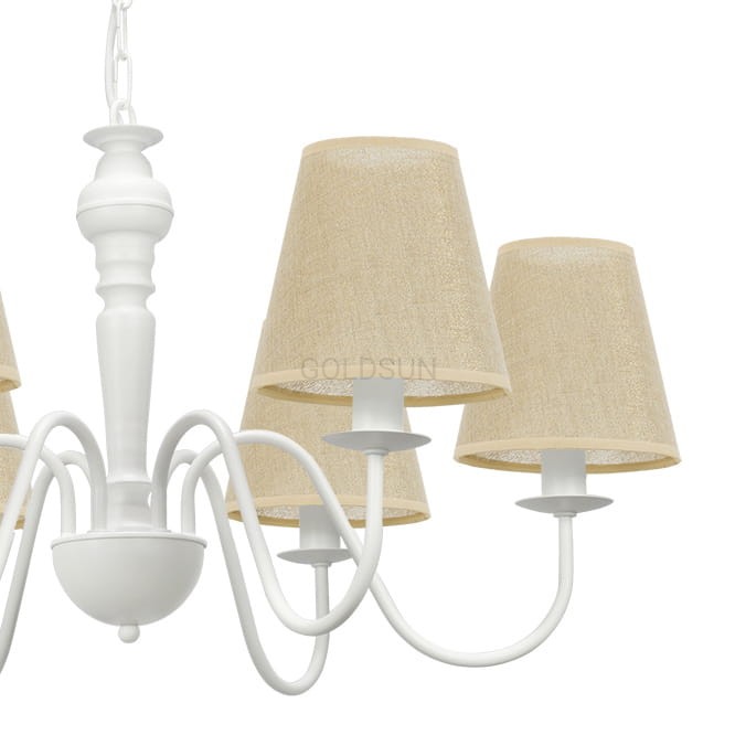 Żyrandol w stylu prowansalskim GOLDSUN. Sześciopunktowy żyrandol z abażurami ze złotego lnu na białym stelażu to klasyczne połączenie jasnych, naturalnych kolorów. Ciepły odcień tkaniny ociepla chłód bieli, tworząc zrównoważoną i estetyczną kompozycję. Abażury z lnu delikatnie przepuszczają światło, co buduje przyjazny, domowy klimat. Lampa będzie idealna do kuchni, jadalni lub przestronnych wnętrz w stylu rustykalnym albo prowansalskim. Model wyprodukowano w Polsce.